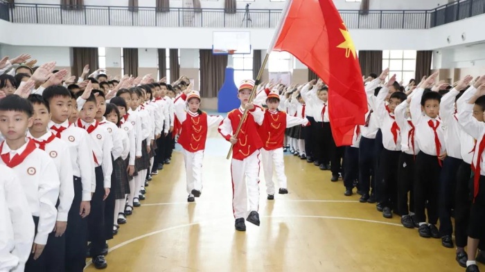 最后,儀式在隊員們“時刻準備著!”的呼號聲中圓滿結(jié)束。嘹亮的呼號聲在體育館上空回響,整個入隊儀式莊嚴而隆重。