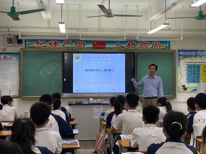 何杰華同志開講的思政第一課題為《敢問路在何方》,貼近當(dāng)下初三級學(xué)生面臨中考學(xué)習(xí)壓力的現(xiàn)實。課上,何杰華同志以中國古典四大名著之一的《西游記》作為導(dǎo)入,引發(fā)學(xué)生集體共鳴,在通往成功的路上,正如電視劇《西游記》主題曲《敢問路在何方》說的,必定會面對非常多的坎坷艱險。