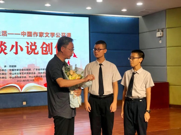 9月26日下午,由中國作家協(xié)會社聯(lián)部,廣東省作家協(xié)會主辦,中山市文學(xué)藝術(shù)界聯(lián)合會、中共中山市南區(qū)街道工作委員會承辦,中山市作家協(xié)會、中山市僑中英才學(xué)校協(xié)辦的“文學(xué)照亮生活——中國作家文學(xué)公開課”走進(jìn)廣東省中山市,在僑中英才學(xué)校一樓多功能廳正式開講。全國少數(shù)民族文學(xué)創(chuàng)作駿馬獎獲得者、遼寧省作協(xié)副主席周建新以“漫談小說創(chuàng)作”為主題進(jìn)行講授,帶給中山文學(xué)愛好者一場文學(xué)盛宴。