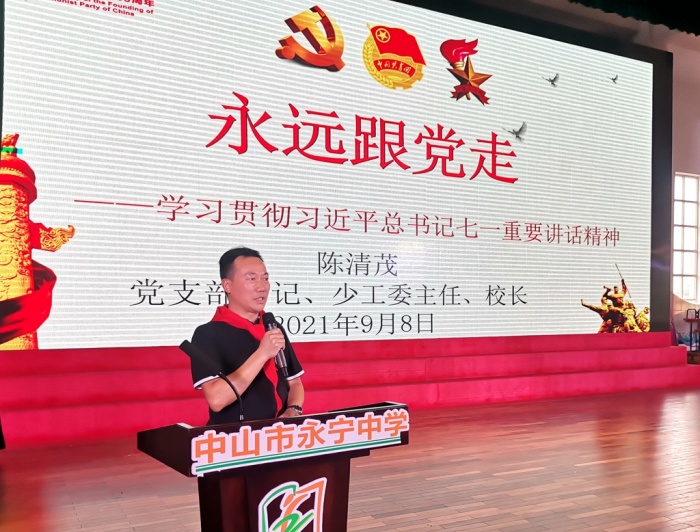 第三議程,由永寧中學(xué)少工委主任陳清茂校長作少先隊開學(xué)第一課《永遠(yuǎn)跟黨走》。陳校長從興國、富國、強(qiáng)國三個時期講述了中國共產(chǎn)黨在實現(xiàn)中華民族偉大復(fù)興進(jìn)程中取得的偉大成就;總結(jié)了實現(xiàn)中華民族偉大復(fù)興必須堅持的成功經(jīng)驗,解讀中國共產(chǎn)黨的成功密碼;他激勵少先隊員們在新時代,要牢記殷切希望,勇?lián)鷼v史使命,立志做一個有理想、有志向、有追求、有責(zé)任感、有奉獻(xiàn)精神的接班人。