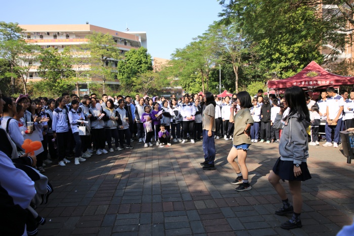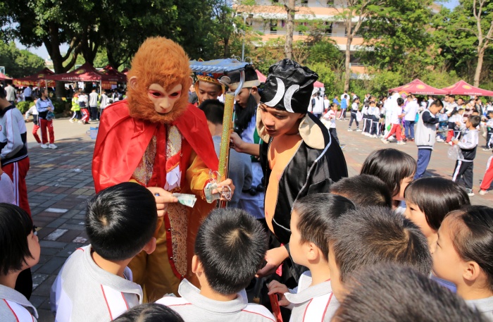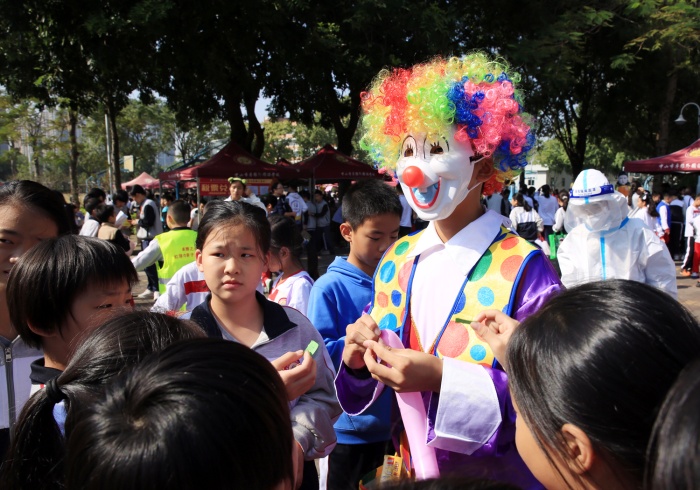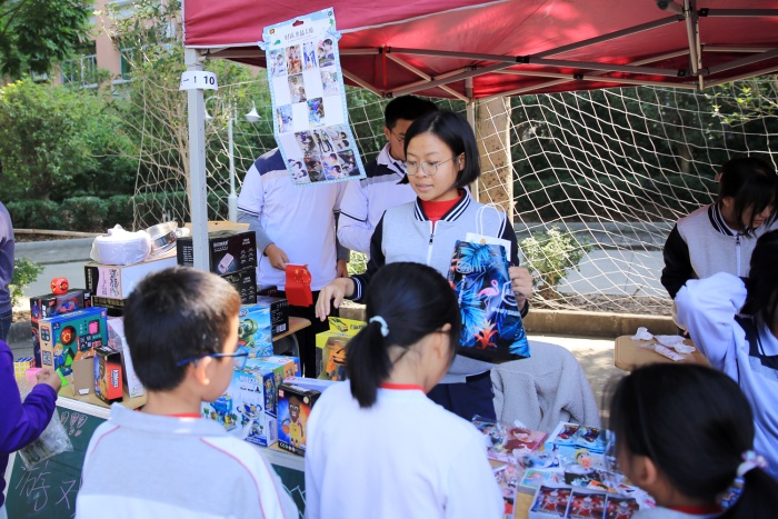 “瞧一瞧看一看,所有商品保質(zhì)保量,買到賺到!”活動(dòng)現(xiàn)場,叫賣聲、歌聲、歡笑聲此起彼伏,好不熱鬧?!拔饔斡浭洲k限時(shí)搶購,全是童年記憶?!毖b扮成唐僧師徒的四名同學(xué)手拿商品四處叫賣,被小學(xué)部的同學(xué)們團(tuán)團(tuán)圍住求合影,還有會(huì)吹氣球玩偶的“小丑”,活潑可愛的“跳跳虎”,古靈精怪的“外星人”,盛裝打扮的他們拿著小喇叭、高舉宣傳海報(bào)四處兜售商品,有的班級(jí)還通過吉他彈唱、舞蹈等才藝招攬客戶。