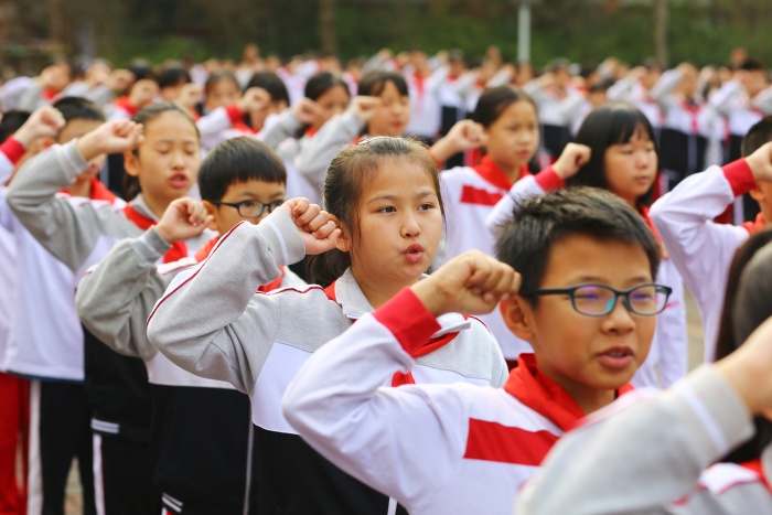活動中,六(2)中隊(duì)帶領(lǐng)全體隊(duì)員表演《少年中國說》,“少年強(qiáng)則國強(qiáng),少年獨(dú)立則國獨(dú)立,少年自由則國自由,少年進(jìn)步則國進(jìn)步……”六(2)中隊(duì)隊(duì)員手拿紅色折扇配合整齊的動作深情誦讀,全體學(xué)生跟誦,表現(xiàn)出卓雅少年的朝氣蓬勃,也表達(dá)了同學(xué)們敢于將強(qiáng)國大任扛于肩頭的決心。