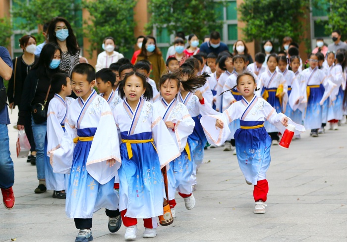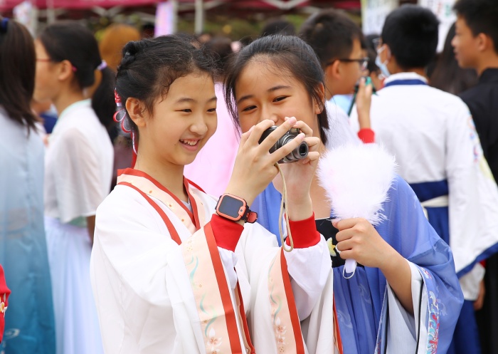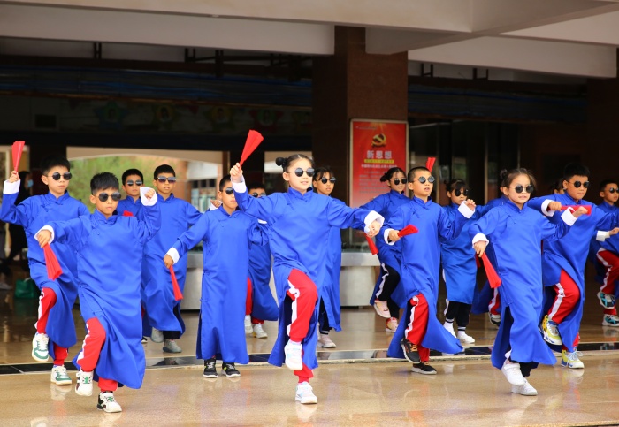 大課間,家長們來到操場,觀看“課外閱讀校本課程成果展示”,同學(xué)們身著漢服盛裝出席,手持折扇風度翩翩,以情景劇、歌舞表演、手語操、詩歌朗誦等形式,再現(xiàn)西游記、千字文、魯濱遜漂流記等中外名著名篇的精彩內(nèi)容,小學(xué)部還邀請家長身著傳統(tǒng)服飾參與到茶藝表演中,與同學(xué)們一起感受優(yōu)秀的中國傳統(tǒng)文化。