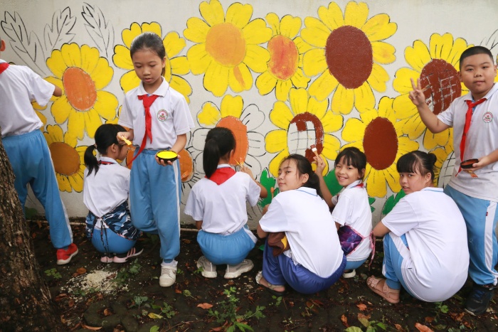 八月第一天雖然陰雨綿綿,但絲毫不影響志愿者們齊動手、共參與的熱情,所有參與本次活動的志愿者都早早地到達了活動地點——光明小學(xué)停車場旁的墻壁,大家都迫不及待地想要拿起自己的畫筆進行創(chuàng)作啦!活動開始前,由美術(shù)老師鄧碧興和丁常臻老師在墻壁上勾勒出大概的繪畫輪廓;緊接著就由各個班的班主任分發(fā)繪畫工具,告知本班負責(zé)的繪畫區(qū)域以及注意事項,只見孩子們個個都拿起畫筆,一會兒若有所思,一會兒靈機一動,家長們也不甘示弱,也使出渾身解數(shù),一會幫忙遞繪畫工具,一會兒洗畫筆,在大家的合理分工,共同努力之下,原本單調(diào)的墻壁愈發(fā)變得燦爛有趣,你看!一朵朵向日葵正在和大家打招呼呢!一棵棵大樹正努力向陽生長呢!時間過得很快,活動快要接近尾聲,但是大家卻意猶未盡,所有的志愿者努力把自己對文明城市的美好期待通過手中的畫筆呈現(xiàn)出來。