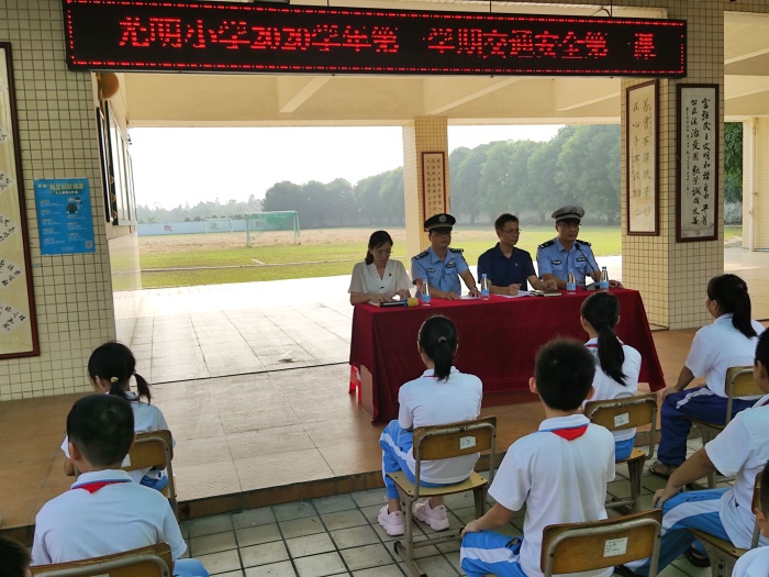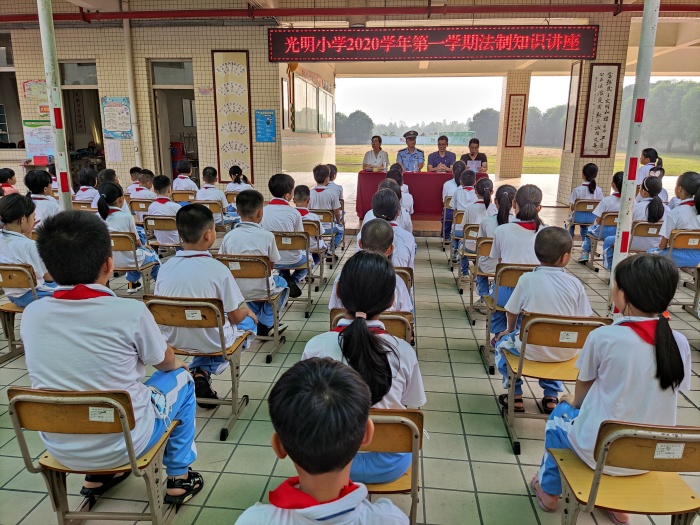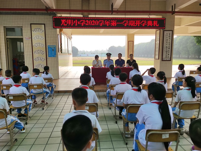 莊嚴(yán)隆重的升旗儀式拉開了開學(xué)典禮的序幕。此次開學(xué)典禮由黃麗娟副校長主持,活動共分為三個(gè)流程:首先,法制副校長黃順明警官為全體師生開展了一次法制講座。黃警官分別從防毒禁毒、保護(hù)好個(gè)人人身安全、預(yù)防新冠肺炎三方面為同學(xué)們敲響警鐘,他誠摯的話語,鮮活的案例,讓會場上響起了熱烈的掌聲。接著,由德育主任林秋影在典禮上親切講話。她熱情地歡迎了一年級的新生加入了光明小學(xué)溫暖的大家庭,也對同學(xué)們上一學(xué)年的表現(xiàn)給予了充分的肯定,同時(shí),也對同學(xué)們提出了新學(xué)期的新要求:一是做一個(gè)誠實(shí)守信、樂于助人,講文明懂禮貌的好學(xué)生;二是自覺自愿的遵守學(xué)校的規(guī)章制度,讓文明之花在校園綻放;三是要善待自己的生命,尊重自己和他人的生命。最后,莫文杰校長為典禮慷慨致辭,他勉勵(lì)同學(xué)們要做到以下三點(diǎn):相信自己、對自己負(fù)責(zé)、與人合作以及以書為友。莫校長的諄諄教誨不僅飽含著校領(lǐng)導(dǎo)對同學(xué)們的厚望,更為光明小學(xué)確立了新學(xué)期的努力方向,讓師生們倍受鼓舞和激勵(lì)。