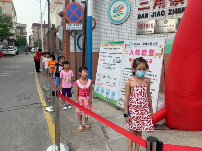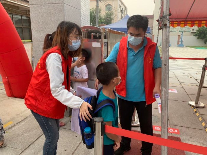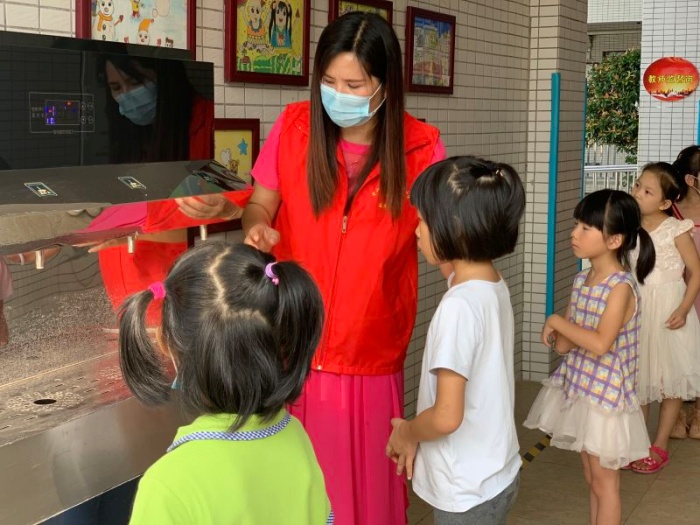 早上7點15分,沙欄小學崔煥英校長親自帶領黨群志愿者們早早站在校門口準備好迎接一年級的小朋友,一年級的班主任以及科任老師也早已在教室里等候學生。家長們帶著孩子陸續(xù)來到校門口,黨群志愿者們從家長手里接過孩子,帶著孩子測量體溫,用免洗消毒液洗手,然后由另一個志愿者手牽手帶著學生到班級交給班主任。緊接著,崔煥英校長與班主任們帶領一年級新生熟悉上學進校門要在指定路線站黃點排隊等候,人與人之間相隔一米的距離,進入校門后去洗手盆洗手。崔煥英校長親自為一年級新生示范“七步洗手法”,親自帶領學生到飲水機示范接水的步驟。