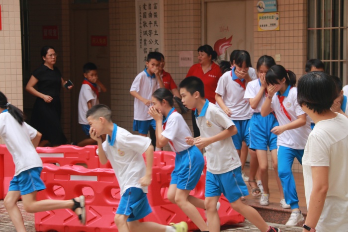 16點,火災(zāi)警報聲拉響。各班學生在班主任的組織下迅速從課室撤離到走廊,其余老師快速到達指定崗位協(xié)助、指揮學生按照指定路線進行撤離。疏散過程中,老師們時刻提醒學生盡量壓低身體,捂住口鼻快速、有序地撤離,到達學校空曠大操場的安全地帶。接著,各班立即清點人數(shù),并迅速上報給演練總指揮王輝副校長,確保每一位學生都安全撤離。