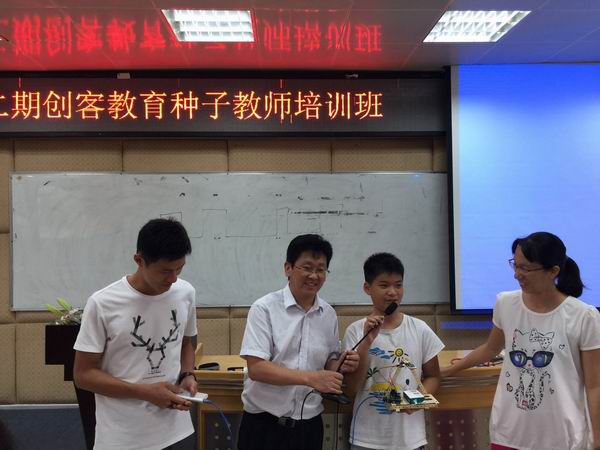 培訓(xùn)的第一天上午,區(qū)教育發(fā)展中心裝備與信息化室蔡海輝老師主持簡(jiǎn)單的開班儀式,對(duì)培訓(xùn)目標(biāo)、培訓(xùn)課程設(shè)計(jì)、導(dǎo)師團(tuán)隊(duì)和學(xué)員參訓(xùn)要求等進(jìn)行了介紹,隨后,德勝學(xué)校梁錦明老師毫無保留地分享見解獨(dú)到的創(chuàng)客教育理念,結(jié)合自身專業(yè)成長(zhǎng)經(jīng)歷,分享草根平民化創(chuàng)客教育之路,并對(duì)區(qū)第三屆創(chuàng)客節(jié)創(chuàng)客現(xiàn)場(chǎng)挑戰(zhàn)賽的比賽規(guī)則進(jìn)行詳細(xì)的解讀。下午和第二天上午,由講師團(tuán)的培訓(xùn)講師帶著老師們認(rèn)識(shí)常用的開源硬件電子模塊及其應(yīng)用項(xiàng)目搭建。在講師和助教們的耐心引領(lǐng)和指導(dǎo)下,老師們掌握了常用電子模塊的電路搭建和編程。