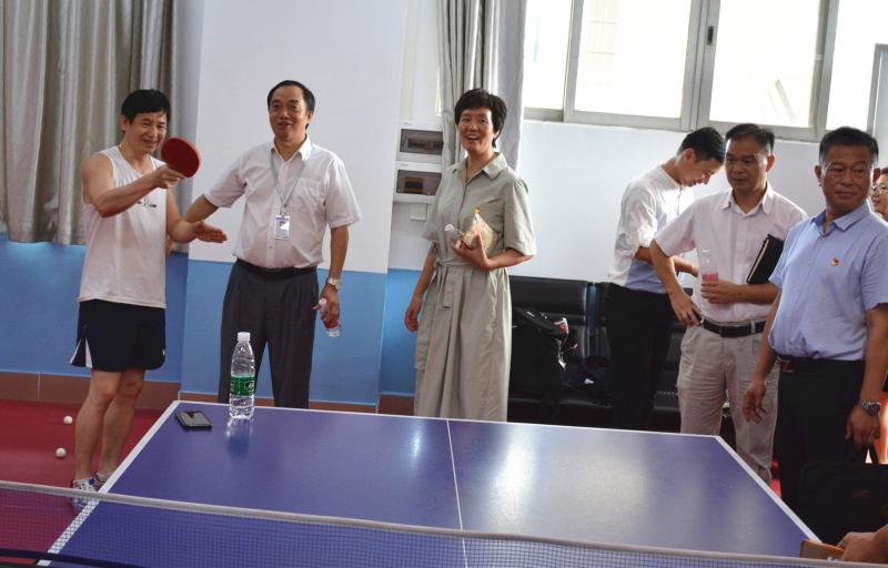 領(lǐng)導(dǎo)高度贊賞乒乓球室裝潢贊助者楊軍先生(左一)支持教育的善舉。