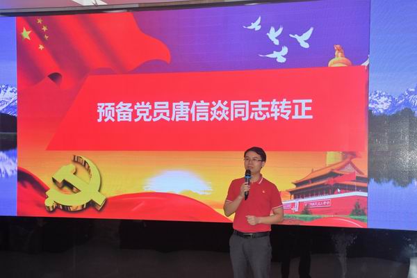 黨員大會(huì)分三項(xiàng)議程。第一項(xiàng)議程是預(yù)備黨員唐信焱同志的轉(zhuǎn)正討論及表決。唐信焱同志作了近一年來(lái)的思想、學(xué)習(xí)、生活、工作匯報(bào),隆重地向黨總支提出轉(zhuǎn)正申請(qǐng)。其入黨介紹人及其他黨員同志分別對(duì)其表現(xiàn)作了表態(tài)發(fā)言。全體黨員舉手表決,全票通過(guò),同意唐信焱同志按時(shí)轉(zhuǎn)正,正式成為中國(guó)共產(chǎn)黨黨員。唐信焱同志表示以后要一如既往,不忘初心,牢記使命!