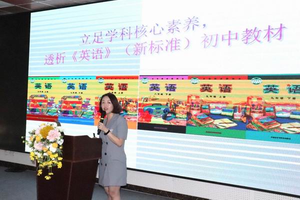 隨后,廖老師為與會老師帶來《立足學(xué)科核心素養(yǎng)透析《英語》(新標(biāo)準(zhǔn))初中教材》主題講座,分享了她對英語綜合能力的理解。隨后從教材結(jié)構(gòu)出發(fā),細(xì)致分析了課標(biāo)與課本在語言技巧、階段特點(diǎn)與側(cè)重、模塊結(jié)構(gòu)等方面的聯(lián)系,期間還結(jié)合問卷調(diào)查、歌曲、優(yōu)秀課例等材料對課標(biāo)與課本做了生動解讀。最后,廖老師就新知呈現(xiàn)、語言操練與練習(xí)、starter以及Unit3的處理等方面分享了幾點(diǎn)教材使用建議,干貨滿滿。