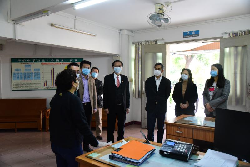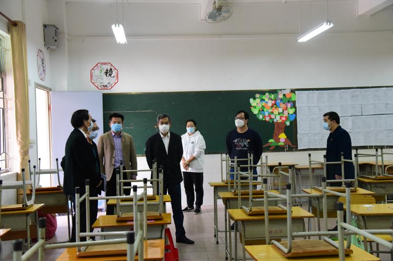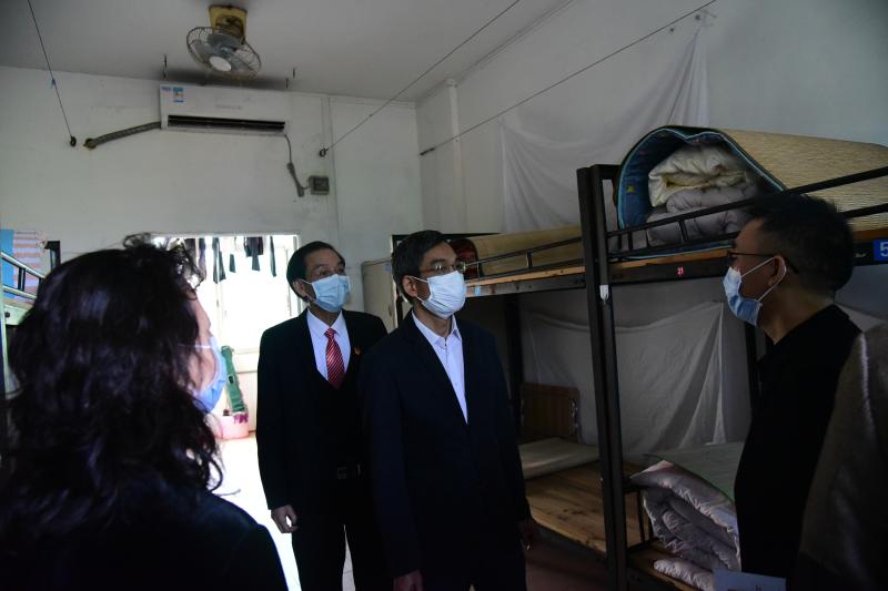 接著,周馭洪副主任一行在吳劍平校長(zhǎng)及學(xué)校行政的陪同下,深入到教室、校醫(yī)室、健康觀察室、學(xué)生宿舍和學(xué)生飯?zhí)玫裙δ軋?chǎng)室進(jìn)行視察。