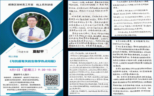 師生組織線上教學(xué)與學(xué)習(xí)是對抗疫情的有力手段,“病毒與疫情”是一個(gè)很好的教育契機(jī),為此順德區(qū)謝樹亮特級教師工作室組織開展了“線上系列講座”,特邀夏獻(xiàn)平老師做了《與抗疫有關(guān)的生物學(xué)熱點(diǎn)問題》專題講座,夏老師是特級教師、正高級教師、省名師工作室主持人,享受深圳市政府特殊津貼,夏老師豐富的專業(yè)知識,結(jié)合當(dāng)前的疫情熱點(diǎn),圖文并茂地給四百余位師生講解了“新冠病毒”中的生物學(xué)知識,線上收聽講座的工作室成員和學(xué)生感受很深,師生們用文字記錄了自己聽講座的感受。