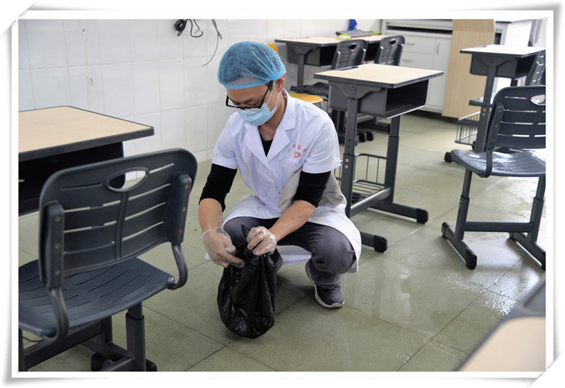 九(2)班教室內(nèi),曾勇和老師為25名學(xué)生講解化學(xué)知識。突然,楊同學(xué)因身體不適而嘔吐。曾老師立即致電校醫(yī)室,梁醫(yī)生在做好個人防護措施后,將學(xué)生帶至隔離室。有序疏散課室學(xué)生后,后勤人員趕往現(xiàn)場科學(xué)清理嘔吐物,并對課室進行消毒。