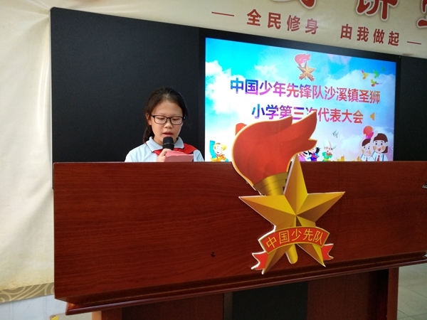 大會在激昂的國歌聲中拉開序幕。首先是五(2)中隊王璽覃隊員、劉韶萱隊員代表向大會獻(xiàn)詞,精彩激昂的獻(xiàn)詞激勵著每一位少先隊員“為共產(chǎn)主義事業(yè)而奮斗”的決心,號召大家用知識做鎧甲,用信念搭建理想之橋,做一個有理想、有道德、有文化的社會主義接班人。隨即是圣獅小學(xué)少工委副主任李春蘭主任向大會致辭,李主任對大會的勝利召開表示熱烈祝賀,同時也表達(dá)了對少先隊員成長的期盼和祝福。