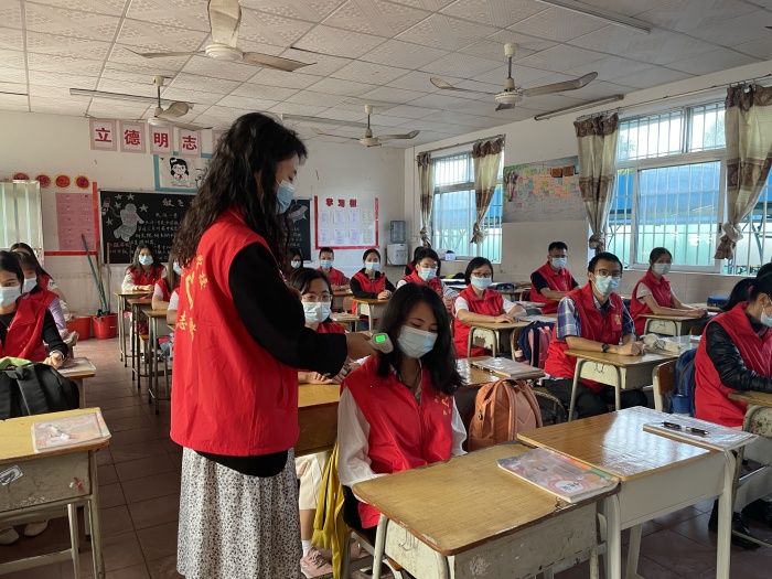 17日早上,學(xué)校開(kāi)展防控模擬演練,模擬師生在上課期間有癥狀異常情況的處置流程。當(dāng)堂教師在例行晨檢中,發(fā)現(xiàn)有“學(xué)生”發(fā)熱現(xiàn)象,老師立即讓該生佩戴好口罩,并引導(dǎo)其出班級(jí),與其他學(xué)生保持距離,立即打電話,讓“保健老師”來(lái)復(fù)檢,保健老師將其帶到觀察室,初步判斷為疑似病例,立即上報(bào)學(xué)校防控負(fù)責(zé)人,再逐級(jí)上報(bào)到“鎮(zhèn)教育主管部門(mén)和疫情防控部門(mén)”。