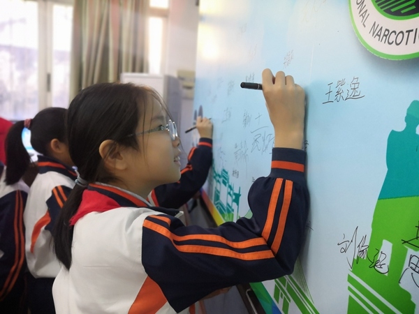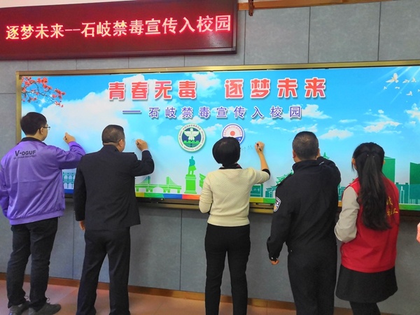 競(jìng)賽答題結(jié)束后就進(jìn)入宣言簽名儀式環(huán)節(jié),在陳遠(yuǎn)華副所長、鄭結(jié)霞校長的帶領(lǐng)下,社工、老師及學(xué)生都有秩序地在橫幅上簽名。最后,學(xué)生和全體工作人員進(jìn)行合影留念,“青春無毒,逐夢(mèng)未來”的禁毒、反詐宣傳活動(dòng)就圓滿結(jié)束了。