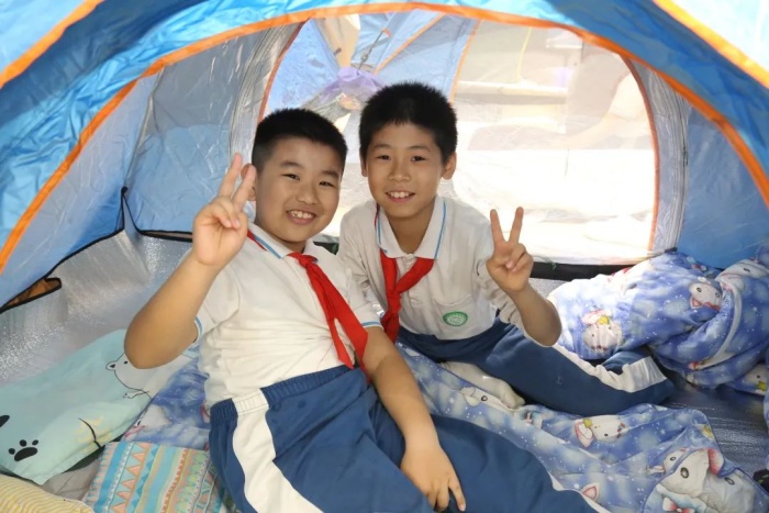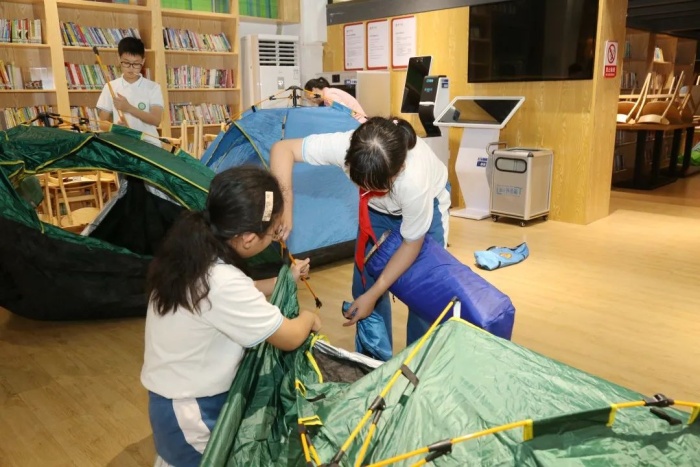 月亮與星星作伴,孩子與帳篷為友。入夜,孩子們在老師的指導(dǎo)、幫助下,搭起小帳篷,沐浴書香中,睡在書山里。夜晚,又有哪本書入夢呢?這個夢好甜……