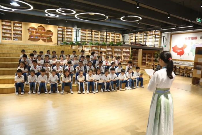 “呦呦鹿鳴,食野之蘋。我有嘉賓,鼓瑟吹笙……”,孩子們以古人迎賓曲《詩經(jīng)·小雅·鹿鳴》迎接嘉賓的到來,在悠揚而充滿古韻的吟誦聲中,“圖書館之夜”大幕開啟……