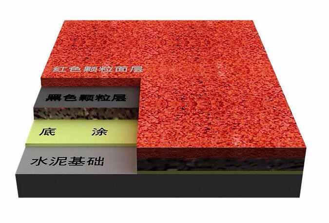 2、場地基礎層采用單組分聚氨脂膠水與彈性橡膠顆粒相結合,為環(huán)保型產品,具有透氣功能;在高溫下,即便地基內產生蒸汽,也會很快散發(fā)出去,蒸汽壓力無法聚集,因此不會產生鼓泡現象。