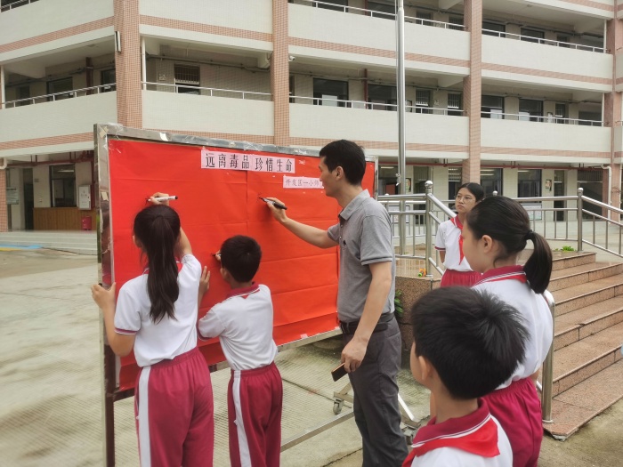 隨后,學(xué)校的大隊(duì)長葛嘉萱宣讀了禁毒倡議書,并帶領(lǐng)全體師生在國旗下慷慨激昂地許下誓言:“遠(yuǎn)離毒品,珍愛生命,與毒品作堅(jiān)決斗爭(zhēng)!從我做起,以抵制毒品為榮,以吸毒販毒為恥,牢記歷史使命,為中華民族的偉大復(fù)興而奮斗!” 宣誓后師生將自己的名字一筆一劃地寫在了簽名橫幅上,表達(dá)了自己珍愛生命、拒絕毒品的決心。