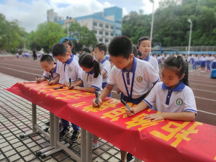 接著該校周瑞珍校長、馮麗芬副校長和教師代表、以及各班的學(xué)生代表共同在橫幅上簽名,簡單而莊嚴(yán)的簽名儀式,表明了全校師生“珍惜糧食 拒絕浪費(fèi)”的共同決心。