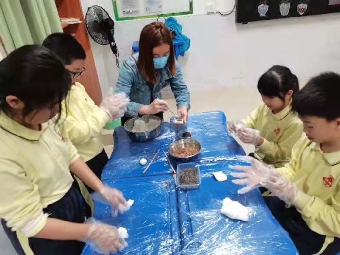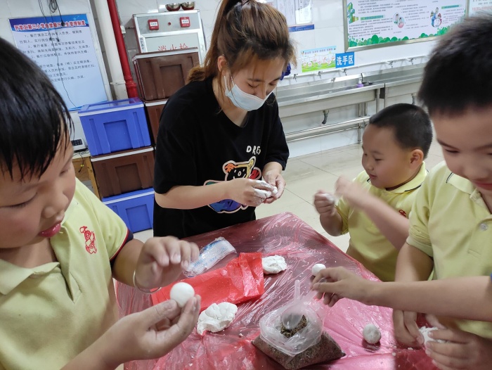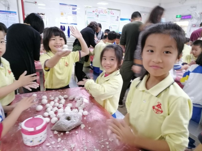 首先,孩子們洗干凈雙手,挽起衣袖,有模有樣的學(xué)著爸爸媽媽的樣子包起湯圓:先拿和好的糯米粉團(tuán)揪一小團(tuán),糯米面,讓孩子們擠壓成圓片形狀,再挑一團(tuán)餡放在糯米片上,最后用雙手轉(zhuǎn)邊收口做成一個(gè)小圓球??粗粋€(gè)個(gè)圓溜溜的湯圓真可愛(ài)!緊接著,煮湯圓時(shí),先燒開水,把湯圓慢慢放入鍋內(nèi),輕輕的攪開,湯圓浮出水面代表已經(jīng)煮熟。活動(dòng)最后,家長(zhǎng)伴著《賣湯圓》的優(yōu)美旋律和孩子們一起品嘗著自己的勞動(dòng)成果,每個(gè)人的臉上都洋溢著過(guò)節(jié)的喜慶。
