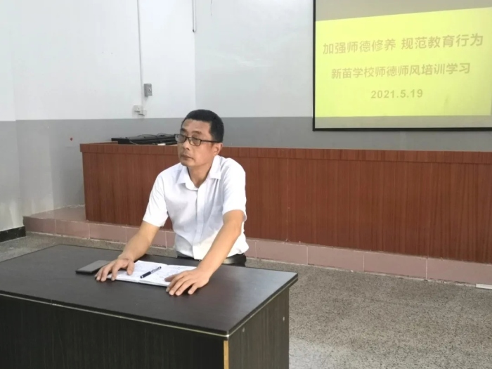 為進(jìn)一步提高教師的業(yè)務(wù)水平,樹立良好的教師形象,打造一支師德高尚、教風(fēng)優(yōu)良的優(yōu)秀團(tuán)隊(duì),5月19 日晚,新苗學(xué)校組織全體教師在修身學(xué)堂開展了以“加強(qiáng)師德修養(yǎng) 規(guī)范教育行為”為主題的師德師風(fēng)培訓(xùn),此次培訓(xùn)由段岳華副校長(zhǎng)主持。