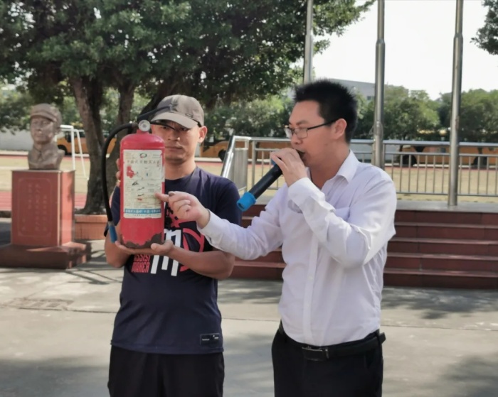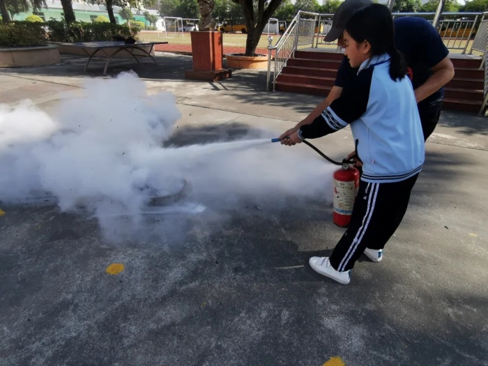 負(fù)責(zé)安全的俞希金老師非常仔細(xì)的向在場(chǎng)師生講解干粉滅火器的使用方法:“把滅火器罐上下晃動(dòng)三次以上,將安全梢拉開,握住出粉皮管,將皮管朝向火點(diǎn),距離火點(diǎn)2米左右用力壓下把手,對(duì)準(zhǔn)火苗根部噴射?!贝蠹叶祭卫斡涀×藴缁鹌鞯氖褂梅椒ā耙粨u、二拔、三噴”。隨后老師手把手的教學(xué)生使用干粉滅火器,滅火成功后,學(xué)生們臉上洋溢著成功的喜悅。
