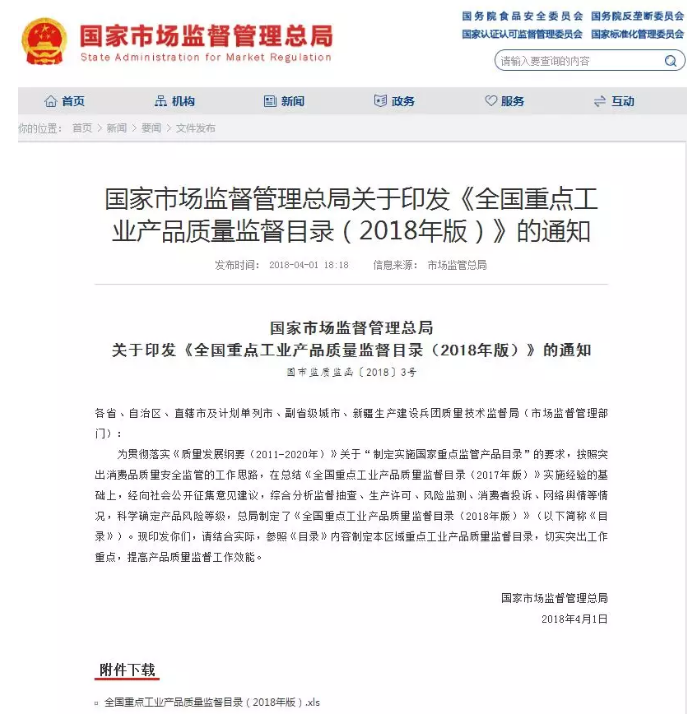 4月1日,國家市場監(jiān)督管理總局印發(fā)了關于《全國重點工業(yè)產品質量監(jiān)督目錄(2018年版)》的通知: