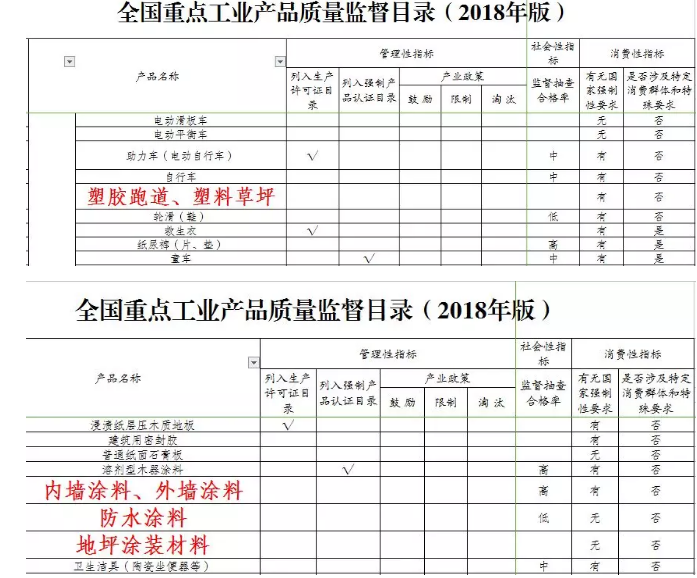 其中,塑膠跑道、人造草坪、內墻涂料、外墻涂料、防水涂料、地坪涂裝材料等被列入《監(jiān)督目錄》,有國家強制性要求(消費性指標)。