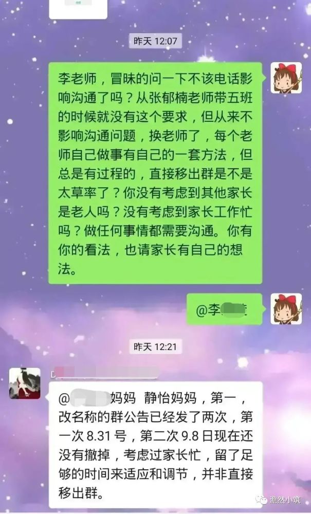 于是這位家長表示之前孩子們的老師沒這么多事兒,直接把人移出去難道沒考慮到群里有老人的情況嗎?沒考慮到家長忙的情況嗎?并向老師表示:“你有你的看法,也請(qǐng)家長有自己的想法。”