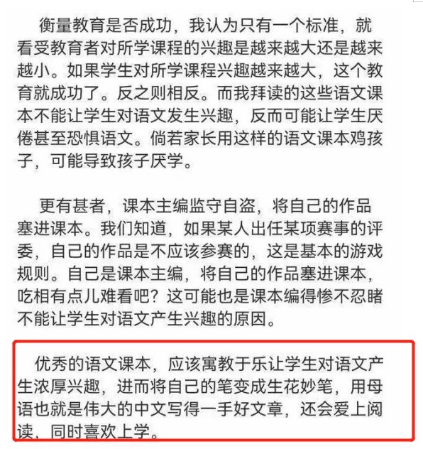 為了佐證語文教材選材上的問題,他還直言,課本主編利用職務(wù)之便將自己的文章塞進(jìn)教材,有“監(jiān)守自盜”的嫌疑。此外,鄭淵潔認(rèn)為,語文課本應(yīng)該讓學(xué)生對(duì)學(xué)習(xí)產(chǎn)生濃厚的興趣,愛母語,愛上學(xué),而不是產(chǎn)生厭惡的心理。