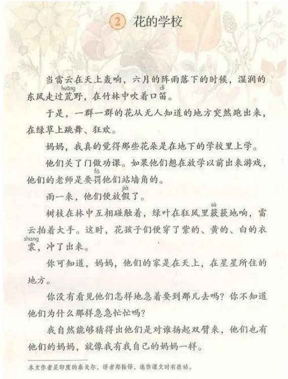 有家長指出,三年級(jí)上冊(cè)中摘錄了泰戈?duì)柕淖髌贰痘ǖ膶W(xué)?!?,雖然泰戈?duì)栐趪H上的知名度很高,他的這篇選文想象力很是豐富,但是其主旨不明朗,在內(nèi)容上的描述上也是天馬行空,讓人不知所云。