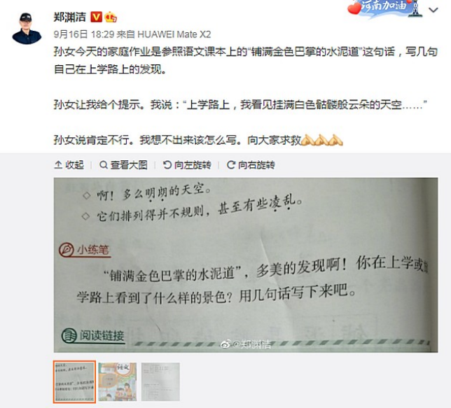 2021年9月中旬,鄭淵潔在個(gè)人賬號(hào)尋求幫助,他在輔導(dǎo)孫女寫作業(yè)的時(shí)候遇到了難題,希望網(wǎng)友們能幫他解答。他把語文書課后的圖片附在動(dòng)態(tài)下方,通過這些圖片可以得知,難道他的題目內(nèi)容是部編教材三年級(jí)上冊(cè)《鋪滿金色巴掌的水泥道》的語句仿寫。