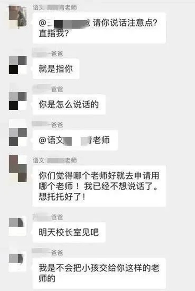 隨著話語(yǔ)的升級(jí),老師和家長(zhǎng)的矛盾也有點(diǎn)升級(jí),老師責(zé)怪家長(zhǎng),嫌棄家長(zhǎng)說話不夠客氣,叫家長(zhǎng)說話注意點(diǎn),此時(shí)家長(zhǎng)也表示聽不慣老師的語(yǔ)氣。于是老師說“你們覺得哪個(gè)老師好就用哪個(gè)老師,想拖拖好了”,家長(zhǎng)此時(shí)也有點(diǎn)憤怒,于是說“我不會(huì)把孩子交給你這樣的老師,明天校長(zhǎng)室見”。意味著家長(zhǎng)會(huì)因?yàn)榇耸峦对V家長(zhǎng)。