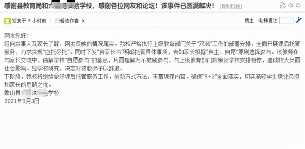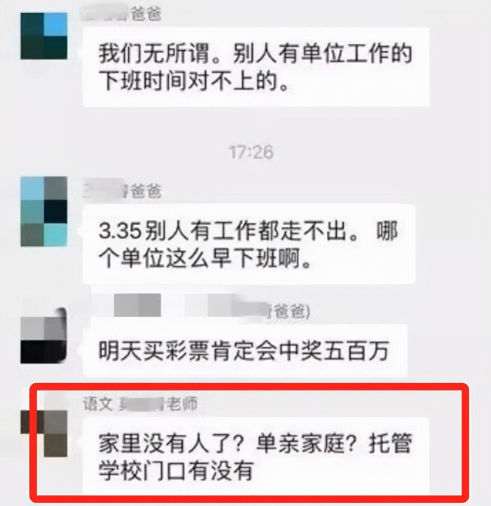 于是班主任說,難道學(xué)生家里沒人了,是單親家庭?沒人接送學(xué)校門口還有托管呢,意思是希望不能按時(shí)接送孩子的家長(zhǎng),可以像過去那樣選擇托管呀,這樣就皆大歡喜了。