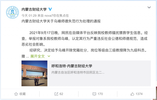 9月21日凌晨,@內(nèi)蒙古財(cái)經(jīng)大學(xué) 微博發(fā)布“關(guān)于烏峰師德失范行為處理的通報(bào)”。