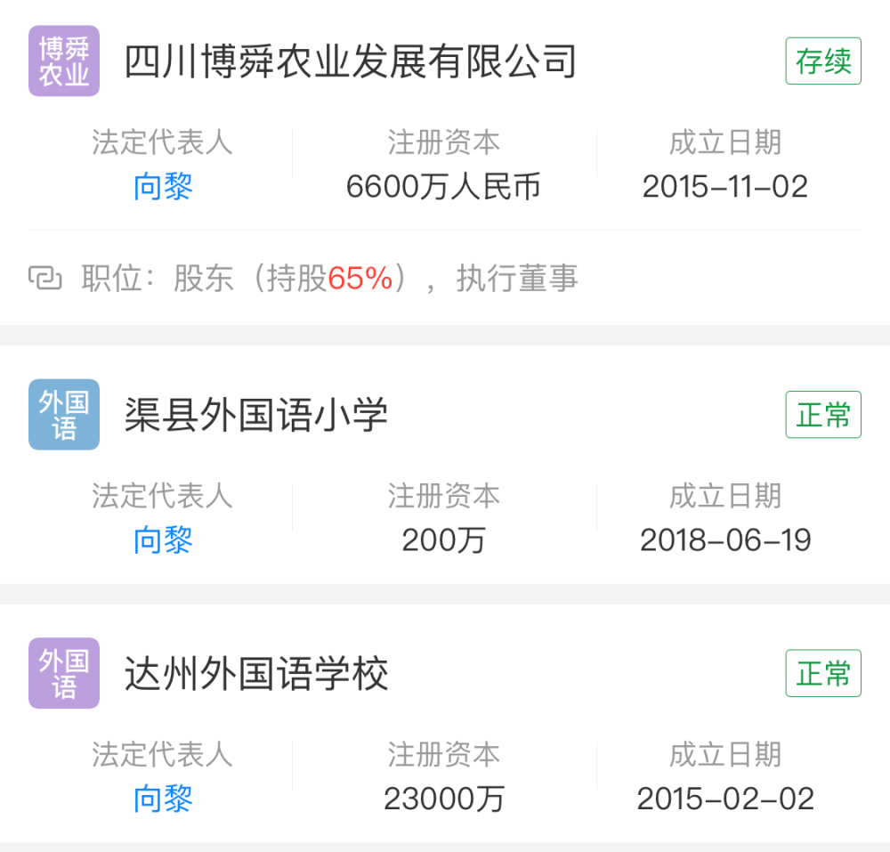 通過(guò)工商注冊(cè)信息可以查到,與校長(zhǎng)向黎相關(guān)的企業(yè)共有15家,其中仍在正常經(jīng)營(yíng)的有11家。11家企業(yè)中,既有渠縣砂石廠和博舜農(nóng)業(yè)發(fā)展有限公司,也有成都碧瑤錦廬餐飲、渠縣德彥山房餐飲、成都碧瑤錦廬大酒店三家餐飲實(shí)體。