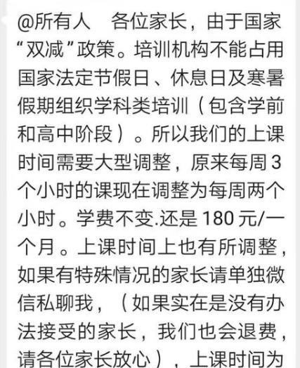 仔細(xì)解讀政策后發(fā)現(xiàn),教育部嚴(yán)查周末開課,而周中補(bǔ)課不在監(jiān)管范圍內(nèi),于是各個補(bǔ)習(xí)機(jī)構(gòu)開始發(fā)布調(diào)課通知,將周末課程安排在周中。