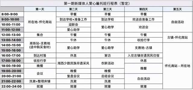 從下圖中的活動(dòng)行程表可以看到,這個(gè)只有短短五天的活動(dòng),刨去第一天和最后一天的行車時(shí)間,以及第四天的歡送會,中間其實(shí)只有兩天的時(shí)間給孩子們“上課”,加起來滿打滿算也只有7節(jié)課。