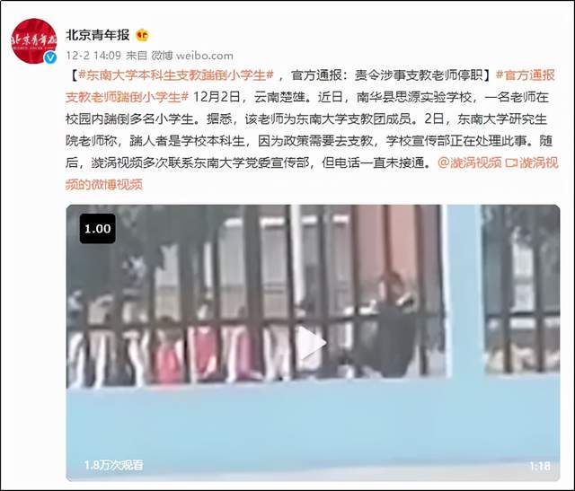 這樣的事情也絕對不是孤例,去年12月初,“支教老師踹倒小學(xué)生”的新聞也登上了熱搜。