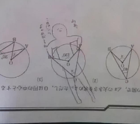 以上的圖畫是在試卷上進行創(chuàng)作的,還是數(shù)學(xué)試卷,被同學(xué)在一個圓的基礎(chǔ)上添加了一個人,并加上了一個向下的箭頭,很有超人的那味道。雖然這位同學(xué)畫得特別地樸素,但是這幅簡筆畫人物的小表情和寓意都是有值得欣賞的地方。