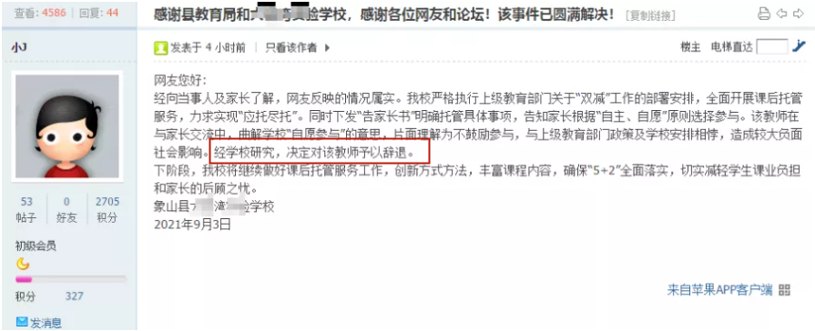 隨后,學(xué)校官網(wǎng)上給出正式回應(yīng),表示已經(jīng)辭退了這名老師。至此,這名語文老師就成了公然與雙減政策叫板后被辭退的“第一人”。