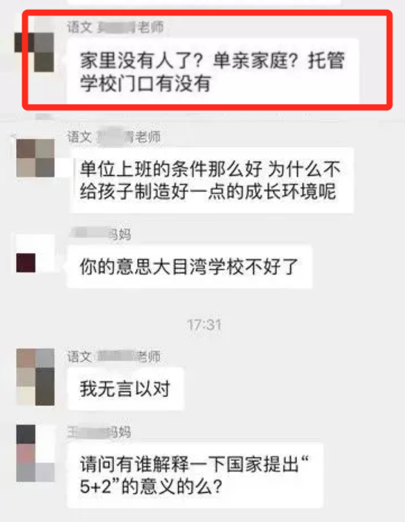 眼看著各地學(xué)校都在開展延時(shí)服務(wù),這個(gè)班家長(zhǎng)很不解,這本來是讓家長(zhǎng)自由選擇的事,怎么突然畫風(fēng)變了,變成老師勸大家都不要參與了呢?于是有家長(zhǎng)在群里提出意見,表示3點(diǎn)35分那些正在工作的家長(zhǎng)根本沒辦法來接孩子。好吧,這一句話不知怎么的就點(diǎn)燃了這位老師的火,她接下來說的話就很不中聽了,她直接在群里對(duì)所有家長(zhǎng)說“家里沒有人了?單親家庭?托管學(xué)校門口有沒有?”
