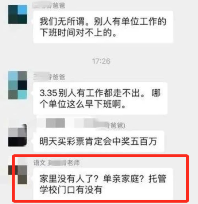 可是似乎是這位家長(zhǎng)的話語(yǔ)激怒了班主任,班主任突然諷刺道,來(lái)上晚托班的孩子都怕不是家里沒(méi)人或者單親家庭吧。