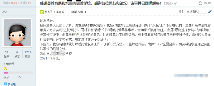 說(shuō)到做到,第二天校長(zhǎng)信箱就收到了家長(zhǎng)的投訴信,這件事情也快速得到了解決,最終結(jié)果是這位出口傷人的老師被校方辭退,可是這件事在網(wǎng)絡(luò)上的影響力還沒(méi)有消失。