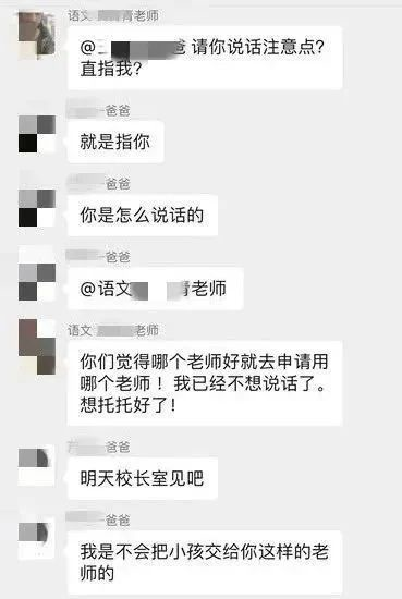 看著群聊截圖,實(shí)在難以想象這是一位班主任在和家長(zhǎng)進(jìn)行“親切交流”,群里面的家長(zhǎng)也紛紛憤怒了,表示明天我們校長(zhǎng)辦公室見。