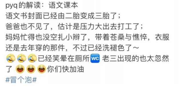 從網(wǎng)友們對小學語文教材封面的聯(lián)想,也能感受到對三胎問題的生育焦慮和教育焦慮。不過這一系列問題都在進一步解決中,在觀望三胎政策的家庭也可以繼續(xù)等待政策的改善。