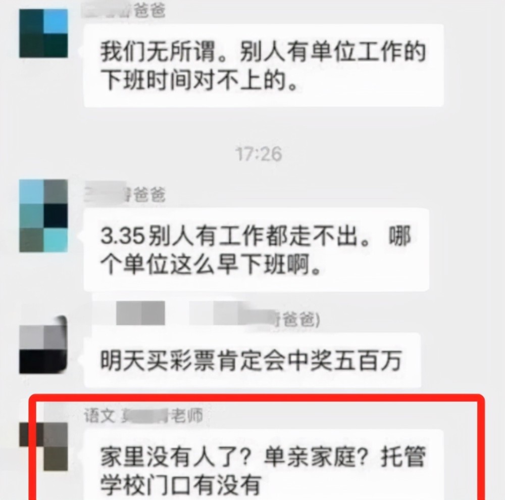 班主任這樣的發(fā)言,也讓很多家長明白了過來,這就是變相勸退,不想讓孩子上課后延時班。有家長表示自己來不及接孩子放學,可能要參加課后延時服務(wù)。這個是侯老師開始出言諷刺:“你家沒人了?你單親家庭”?